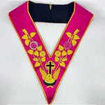 This Scottish Constitution Rose Croix 18th Degree Collar Embroidery is a top-class item that will surely be a valuable addition to any Masonic collection. The intricate embroidery and fine craftsmanship of this collar make it a must-have for any Masonic enthusiast who appreciates attention to detail and superior quality. This collar was manufactured in Pakistan and features the emblem of the Rose Croix, a prominent symbol in the Masonic Order. The collar is perfect for those who are interested in collecting Masonic regalia and should be a great addition to any collection