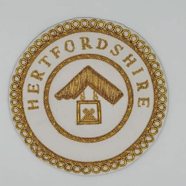 This is a stunning Masonic Regalia from Hertfordshire, featuring a full dress apron with a badge design. The apron is made with high-quality materials and is perfect for any Masonic enthusiast. The design is intricate and features the Craft Masonic Order, making it a unique collectable item. The apron is ideal for those interested in Masonic themes and is a great addition to any collection. It is made in Pakistan and is sure to impress anyone who sees it. The apron is perfect for wearing to events or displaying in a collection.